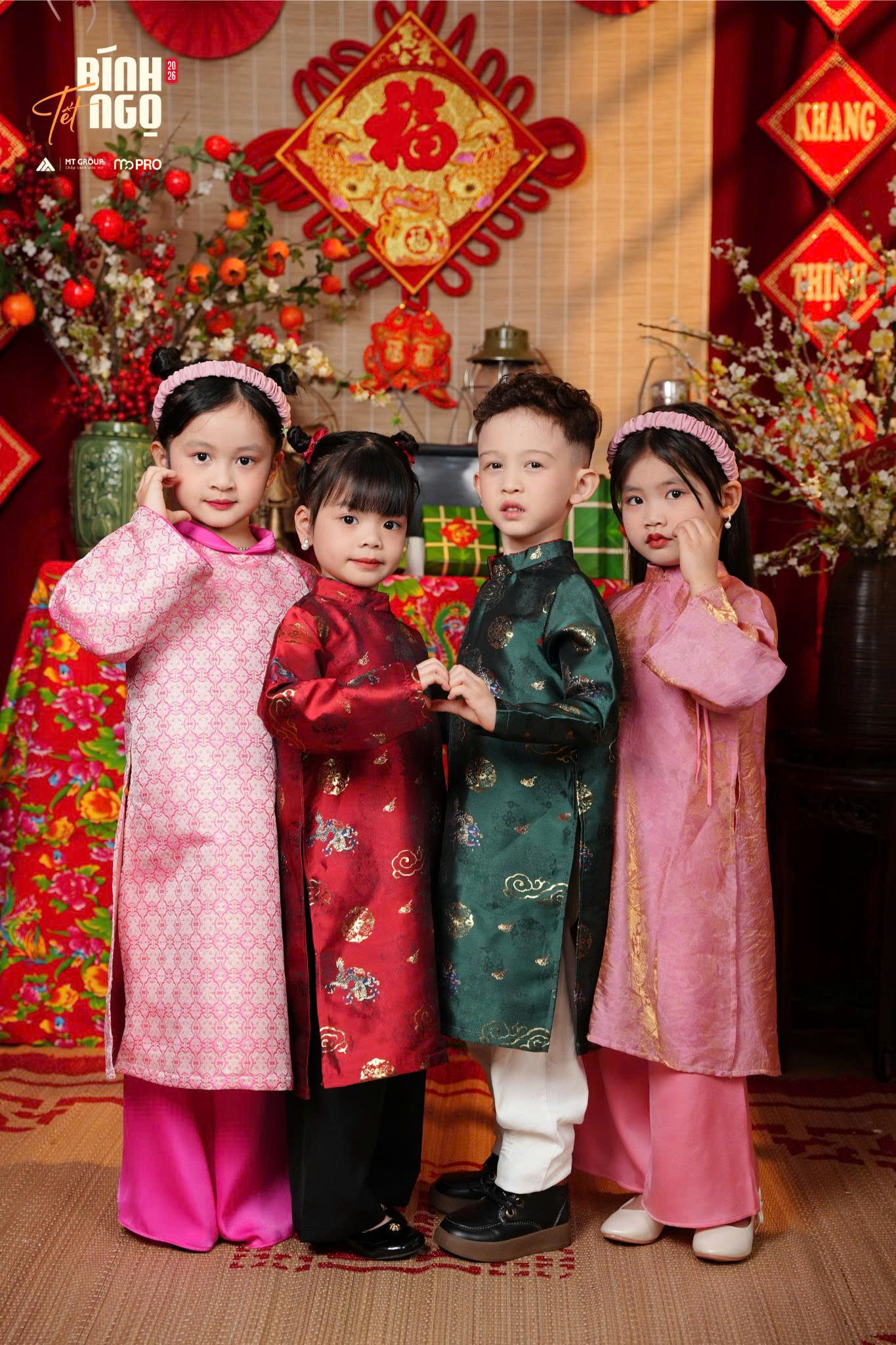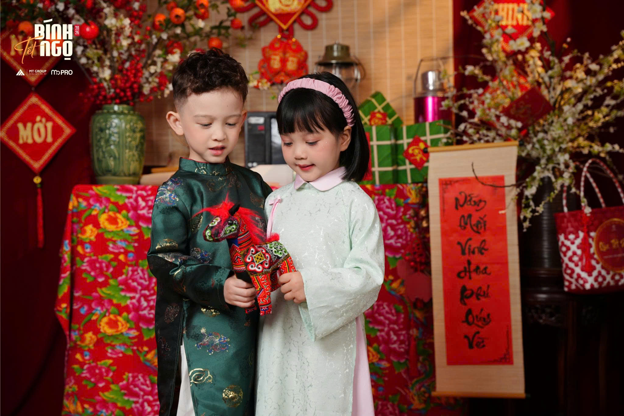 Lấy cảm hứng từ hình ảnh Tết xưa của gia đình Việt, MT Group xây dựng bối cảnh với sắc đỏ may mắn, bánh chưng xanh, câu đối vàng, lọ hoa đào, hoa mai và những vật dụng trang trí quen thuộc. Các bé diện áo dài rực rỡ, khi khoanh tay chào, khi tinh nghịch tạo dáng, mang lại cảm giác như đang thực sự sống trong khoảnh khắc sáng mùng Một ngay tại “ngôi nhà chung” của MT Group.